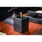 Black Leather Pencil CupNo more coffee mugs or junk drawers, this beautiful black leather pencil cup is the best way to keep your writing instruments close at hand and under control! Designed to match our wide range of classic leather desk accessories, this piece will conveniently hold...