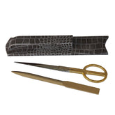 Dark Brown Bonded Leather Mini Library SetThis stylish and affordable Dark Brown Bonded Leather Mini Library Set includes a “Made in Italy” gold letter opener with a pair of 6” scissors. These are stored in the bonded leather sleeve, giving this library set a sturdy look and feel while protecting...